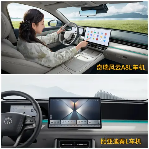 来到车内,两款车型都是采用了当下流行的智能座舱解决方案,比亚迪秦L采用了一块12.8英寸的中控大屏,搭载了比亚迪的DiLink智能车机系统,配备自研的D100车规级芯片,运算能力相当出色;奇瑞风云A8L的中控屏幕则是采用了更大的15.6英寸搭配2K分辨率,显示效果会更好,搭载的是高通骁龙8155车规级芯片,响应速度非常快,可以在30秒内执行20条指令,并且还支持Carplay,而比亚迪秦L是不支持的。