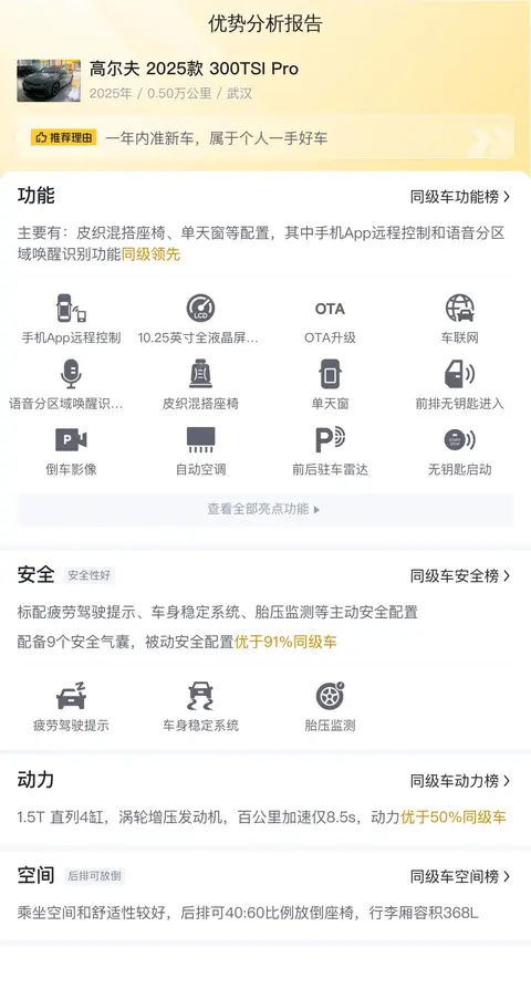 据估算,高尔夫 2025款 300TSI Pro的用车成本是4466元/年,同级车最低是4173元/年,最高是5630元/年,所以它的用车成本合理。