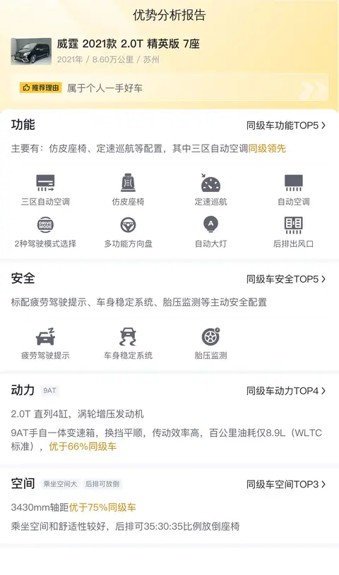 综上所述的新车含税价、用车成本、市场行情、优势分析、同款比价等数据仅供参考。在配置部分,因为二手车非标品,车辆可能会存在配置改装的情况,具体车况信息需要线下结合车辆实际情况进行综合参考。