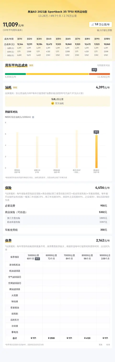 经懂车帝大数据分析,这辆奥迪A3 2021款 Sportback 35 TFSI 时尚运动型的10年平均用车成本约为11382元/年,与同级别车相比处于适中区间。