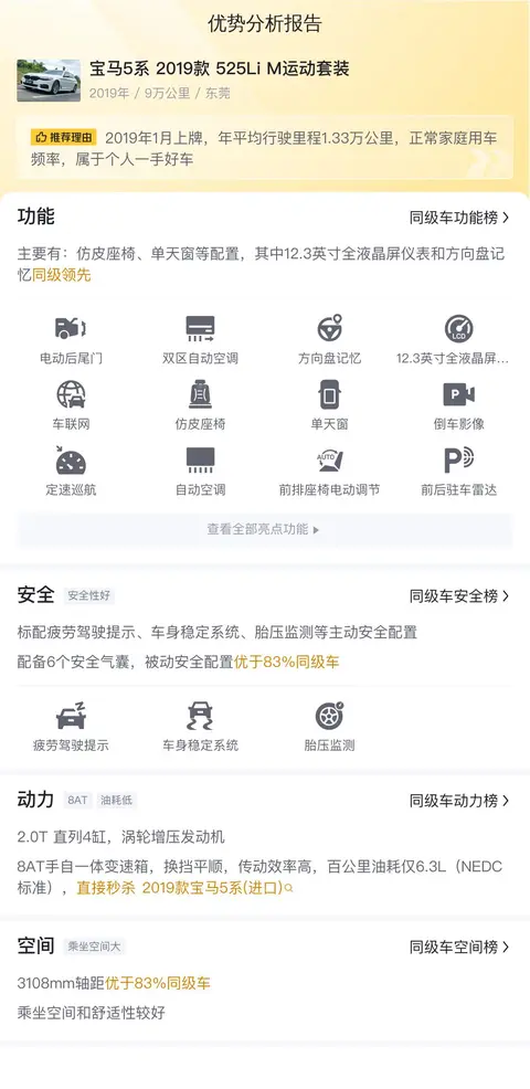 先介绍一下这辆车的基本信息,该车的具体版本是——宝马5系 2019款 525Li M运动套装。该车采用白色外观,上牌地车源地均为东莞,上牌日期2019年1月,表显里程9万公里,符合国VI排放标准,新车指导价42.69万,目前二手车报价15.98万,过户次数0次。