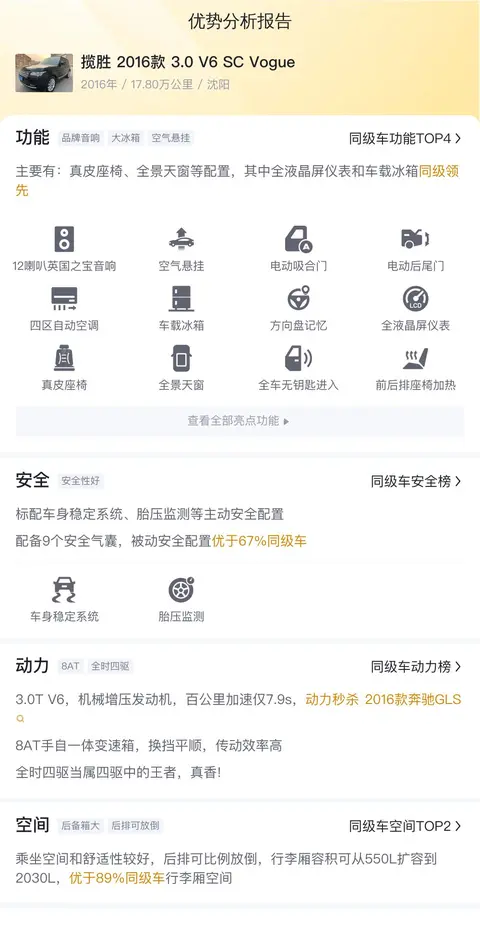 综上所述的新车含税价、用车成本、市场行情、优势分析、同款比价等数据仅供参考。在配置部分,因为二手车非标品,车辆可能会存在配置改装的情况,具体车况信息需要线下结合车辆实际情况进行综合参考。