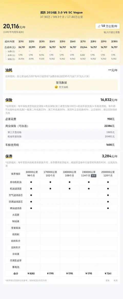 根据预估,这款揽胜2016款3.0 V6 SC Vogue的年度用车成本大约在2.1万元左右。这个成本主要包括了能耗、保险和保养三个方面的费用。其中,能耗方面,该车的百公里油耗为12.2L,按照每年行驶2.1万公里计算,每年的油费大约需要1.3万元左右。保险方面,根据预估,该车的商业保险费用大约在9156元/年左右。保养方面,由于该车已经行驶了17.8万公里,因此保养频率可能会相对较高。根据预估,每年的保养费用大约需要6302元/年左右。需要注意的是,以上所有费用均为预估值,并未考虑个别情况可能产生的额外支出。因此,在购买二手车时一定要充分考虑到这些用车成本,并根据自身经济实力和用车需求做出合理的选择!