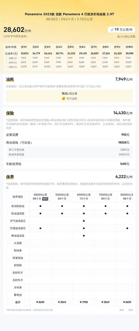 据估算,Panamera 2023款 改款 Panamera 4 行政加长铂金版2.9T的用车成本是28602元/年,同级车最低是18070元/年,最高是40356元/年,所以它的用车成本偏高。