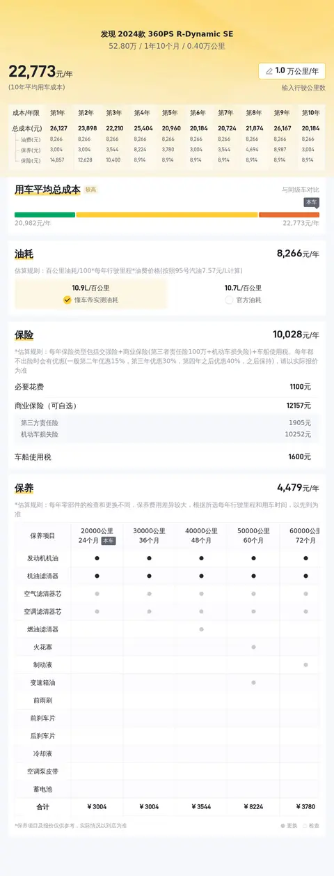 据估算,这辆车的用车成本是23535元/年,同级车最低是23535元/年,最高是43810元/年,用车成本低,也与它2年的车龄有关。