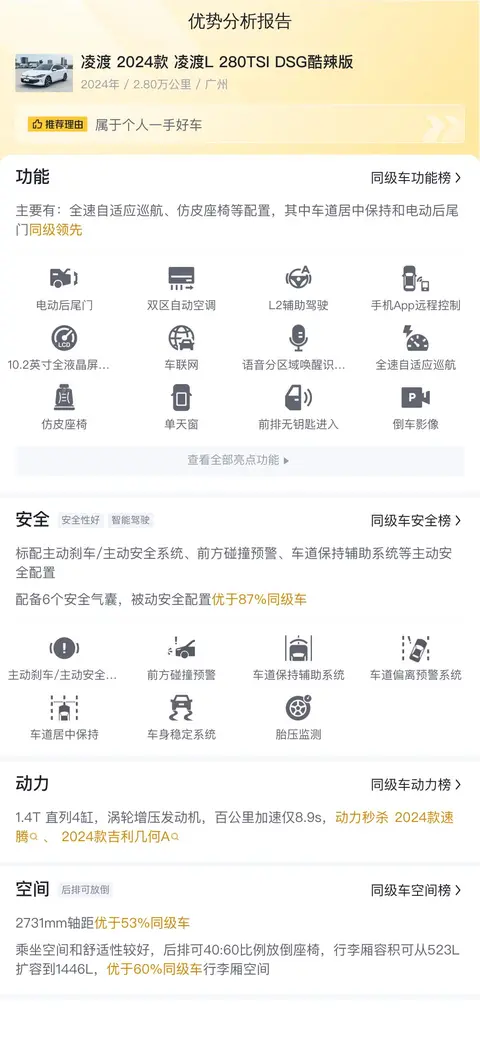 总体而言,凌渡 2024款 凌渡L 280TSI DSG酷辣版是一款集时尚、动感与实用于一体的紧凑型轿车。它的外观设计独特,辨识度高,适合追求个性和品味的消费者。动力方面,它搭载的1.4T发动机提供了充沛的动力输出,同时燃油经济性也表现出色,适合日常通勤和长途旅行。作为一款紧凑型轿车,凌渡的空间表现也相当出色,无论是前排还是后排乘客,都能享受到较为宽敞的乘坐空间。在配置方面,凌渡也展现出了较高的水准,多项配置如全速自适应巡航、车道保持辅助等,提升了驾驶的安全性和便捷性。最后,凌渡的内饰质感也备受好评,软质材料的运用和细节处理都营造出了一种高级感。总的来说,如果你是一位追求个性、品味和实用性兼备的消费者,那么凌渡无疑是一个值得考虑的选择。