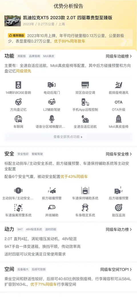 综上所述,这辆二手凯迪拉克XT5 2023款2.0T四驱尊贵型至臻版在车况、配置和性能方面都表现出了一定的竞争力。它不仅拥有豪华SUV应有的宽大空间和丰富配置,还保持着较高的性价比。然而,由于没有检测报告,潜在买家在做出购买决策前应务必亲自查看车辆,确保车况符合个人期望。同时,也可以参考市场上的其他类似车型,进行综合对比,以选出最适合自己的那一款。