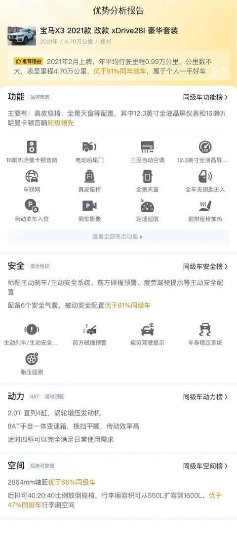 这辆已行驶4.7万公里的宝马X3 2021款 改款 xDrive28i 豪华套装,以其优良的车况、丰富的配置以及合理的价格,无疑是一个不错的选择。如果您正在寻找一辆中型豪华SUV,那么这辆已获得“安心车”认证的宝马X3值得您亲自体验,感受其带来的驾驶乐趣与舒适感。最后,请记住,购买二手车时一定要现场检验车况,确保车辆安全可靠。