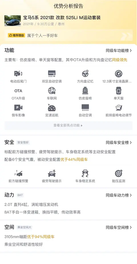 据估算,同级车的最低用车成本是11468元/年,最高是18771元/年,宝马5系 2021款 改款 525Li M运动套装是14555元/年,用车成本适中,但不占优势。