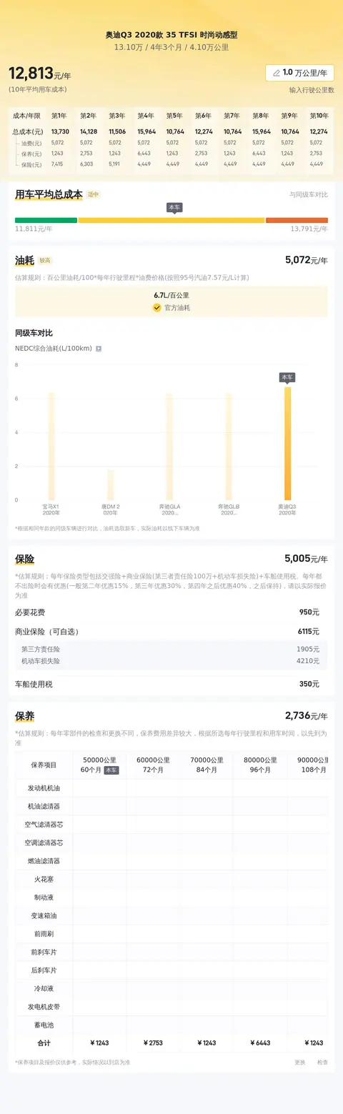 在用车成本方面,这辆奥迪Q3 2020款 35 TFSI 时尚动感型也表现得相当出色。根据相关数据显示,这款车的百公里油耗约为6.7升,这对于一款SUV来说是非常节能的。这意味着您在日常驾驶中,能够有效降低燃油支出,节省一大笔开支。除了油耗之外,奥迪Q3的保养成本也相对较低。由于其卓越的品质和可靠的性能,它不需要频繁的维修和更换零部件,这进一步降低了您的用车成本。而且,奥迪品牌在全国范围内拥有完善的售后服务网络,无论是保养还是维修,都能为您提供便捷和专业的服务。