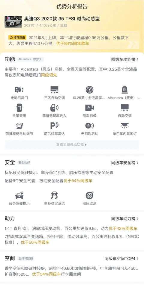 这辆奥迪Q3 2020款 35 TFSI 时尚动感型是一款中高配车型,它的车身颜色为白色,上牌地是在成都,行驶里程为4.1万公里。根据车况检查报告,我们可以看到这辆车的整体状况良好,车身有少量的剐蹭和修复痕迹,但并不影响车辆的使用。同时,内饰整洁如新,功能使用良好。此外,这辆车还未经过任何翻新和美容处理,保持着原始的车况。作为一辆二手车,它在日常使用中难免会出现一些小瑕疵,但这也正是二手车的魅力所在——每一道痕迹都记录着前任车主的故事和经历。不过,请放心,这辆车并不存在重大事故、火烧、水泡或调表等严重问题,您可以安心购买和使用。