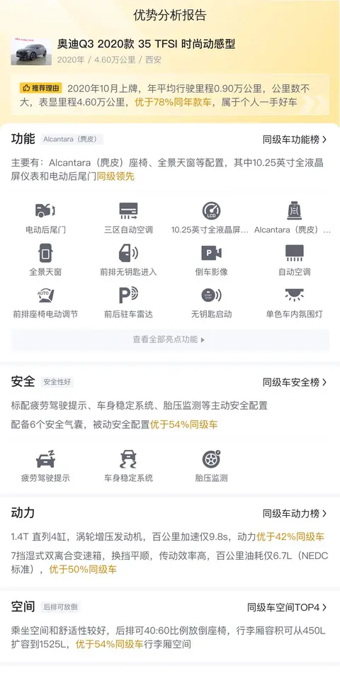 先介绍一下这辆车的基本信息,该车具体版本是奥迪Q3 2020款 35 TFSI 时尚动感型,上牌地为西安,上牌日期2020年10月,表显里程4.6万公里,新车指导价28.68万,二手车报价12.48万,过户次数0次。车主十分注重车辆保养,确保了车辆始终处于最佳状态。这也使得这辆奥迪Q3在二手车市场上更具竞争力。