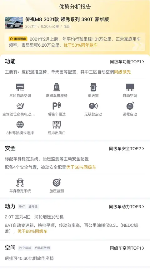 综上所述的新车含税价、用车成本、市场行情、优势分析、同款比价等数据仅供参考。在配置部分,因为二手车非标品,车辆可能会存在配置改装的情况,具体车况信息需要线下结合车辆实际情况进行综合参考。