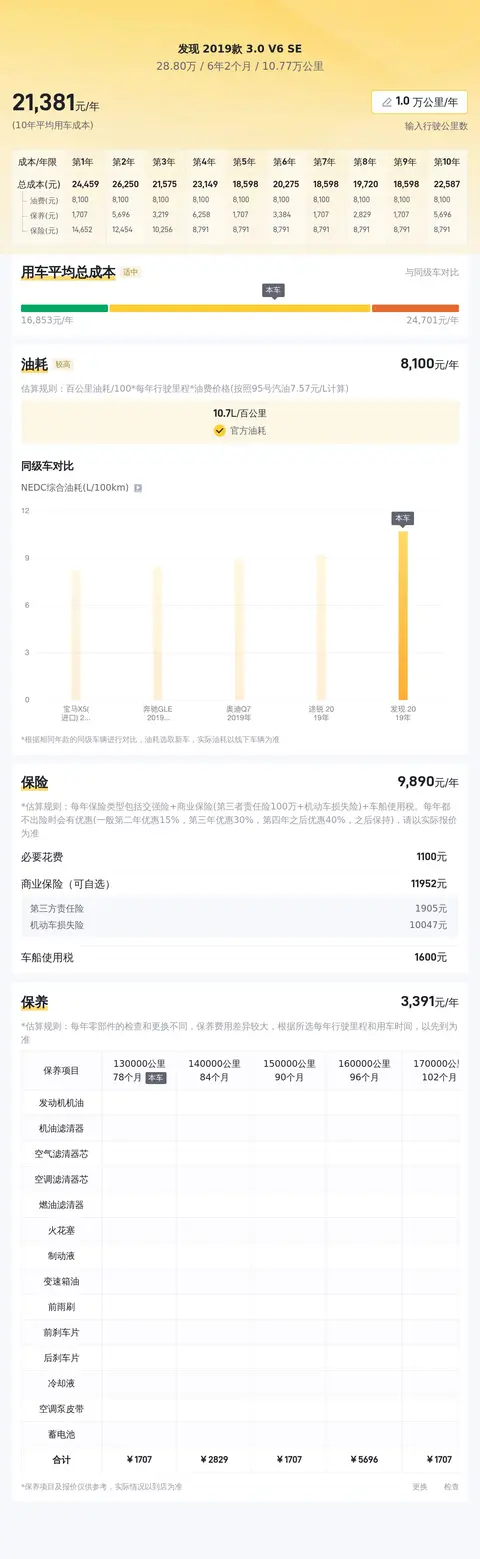 关于用车成本部分,该车的10年平均用车成本大约为20603元/年,这项花销具体金额跟车主的用车场景和驾驶习惯有直接关系。