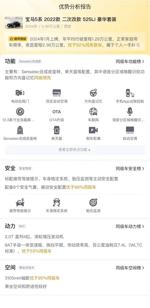 综上所述的新车含税价、用车成本、市场行情、优势分析、同款比价等数据仅供参考。在配置部分,因为二手车非标品,车辆可能会存在配置改装的情况,具体车况信息需要线下结合车辆实际情况进行综合参考。