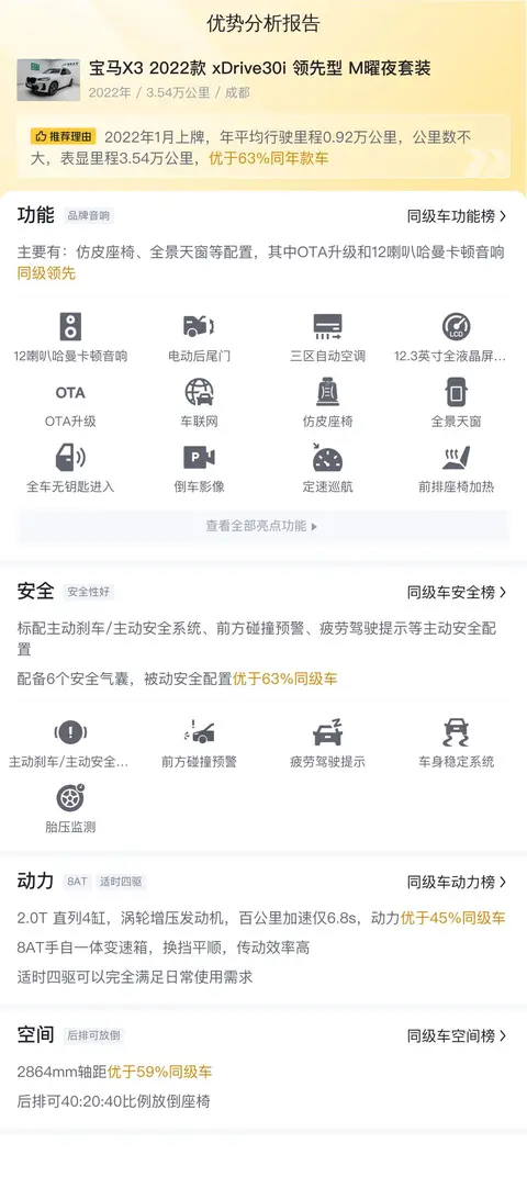 综上所述,这辆宝马X3 2022款 xDrive30i 领先型 M曜夜套装是一款集豪华、运动、科技于一身的四驱SUV。无论是从外观、内饰、空间、配置还是动力等方面来看,该车都表现出色。对于追求高品质生活的消费者来说,这辆宝马X3无疑是一个理想的选择。该车新车售价为43.68万元,现二手车售价为24.99万元,相较于新车价格具有较高的性价比。需要注意的是,该车目前未提供第三方检测报告,潜在买家在购买前应咨询商家获取更详细的车况信息。如果您正在寻找一款既能满足日常出行需求又能提升生活品质的SUV那么这辆宝马X3无疑是一个值得考虑的选择。