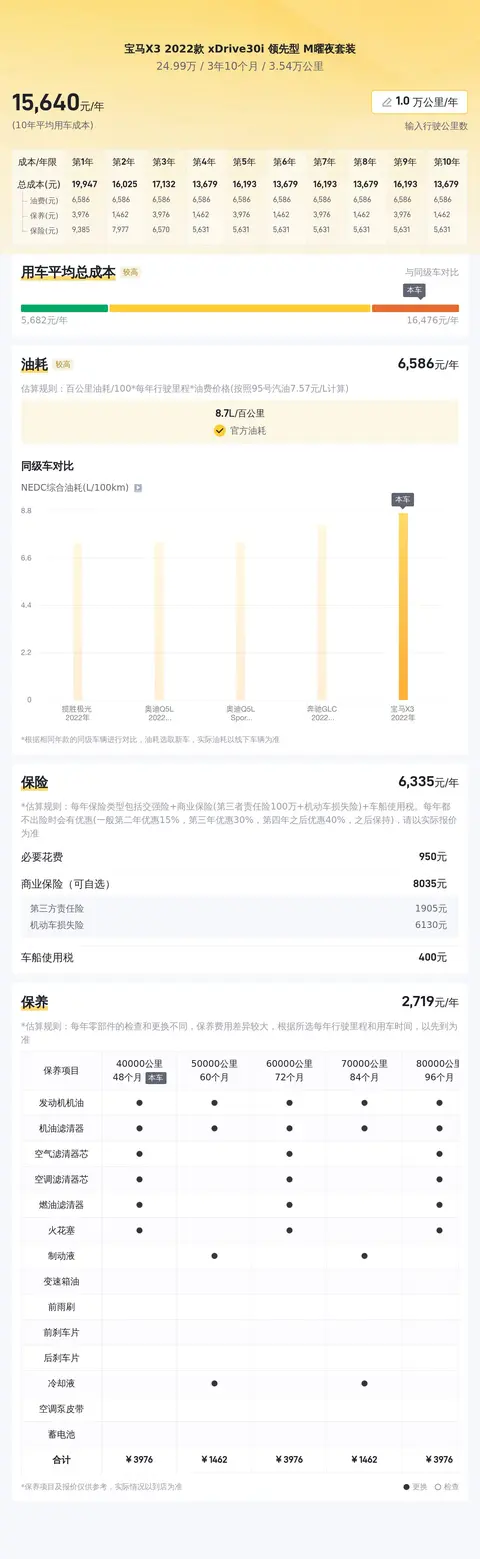 在用车成本方面,这辆宝马X3 2022款 xDrive30i 领先型 M曜夜套装的年均综合用车成本大约为1.6万元,这一成本在同级别车型中处于适中的水平。具体的用车成本会受到油价、行驶里程、停车环境、驾驶习惯等因素的影响。对于追求高品质生活的消费者来说,这一用车成本是可以接受的。