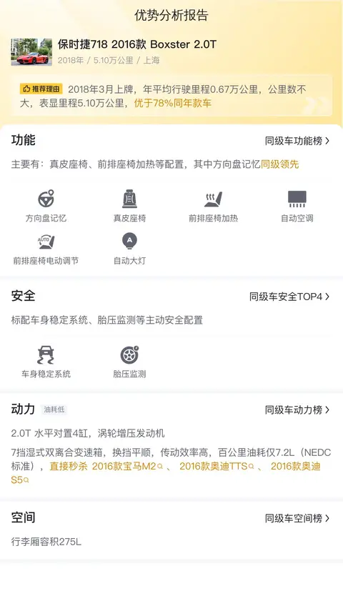 这辆2016款保时捷718 Boxster 2.0T的上牌地为上海,上牌日期2018年3月,表显里程5.1万公里,新车指导价59.80万,二手车报价32.80万,过户次数3次。该车配备2.0T涡轮增压发动机和7速PDK双离合变速器,能够在5.6秒内完成0至100公里/小时的加速,最高时速可达266公里/小时。车身尺寸方面,该车的长宽高分别为4379毫米、1801毫米和1281毫米,轴距为2475毫米。在座椅方面,该车采用两座布局,并配备了电动调节和加热功能,同时方向盘还集成了多功能按键和电动调节功能。该车行李厢容积达到275升,可以容纳一些日常出行所需的物品。在驾驶辅助方面,该车配备了后驻车雷达和中控大屏等配置,提升了驾驶的便捷性和安全性。此外,该车还配备了前排座椅加热、方向盘记忆、多功能方向盘、定速巡航、电动后尾门、自动大灯、外后视镜电动折叠+加热等舒适性和安全性配置。