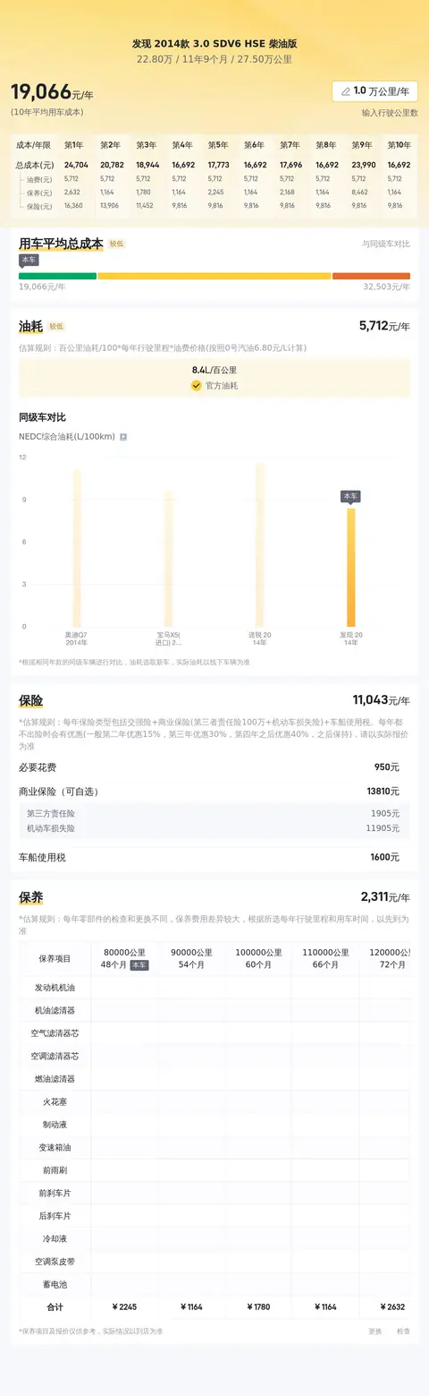 基于懂车帝对发现 2014款 3.0 SDV6 HSE 柴油版的分析,预计该车的年均综合用车成本约为19,189元,每公里的用车成本则大约为0.70元。这一估算是根据该车在全国的保有量及其近半年的销量统计数据分析得出的,实际费用可能会因用车强度、环境等因素有所变动。