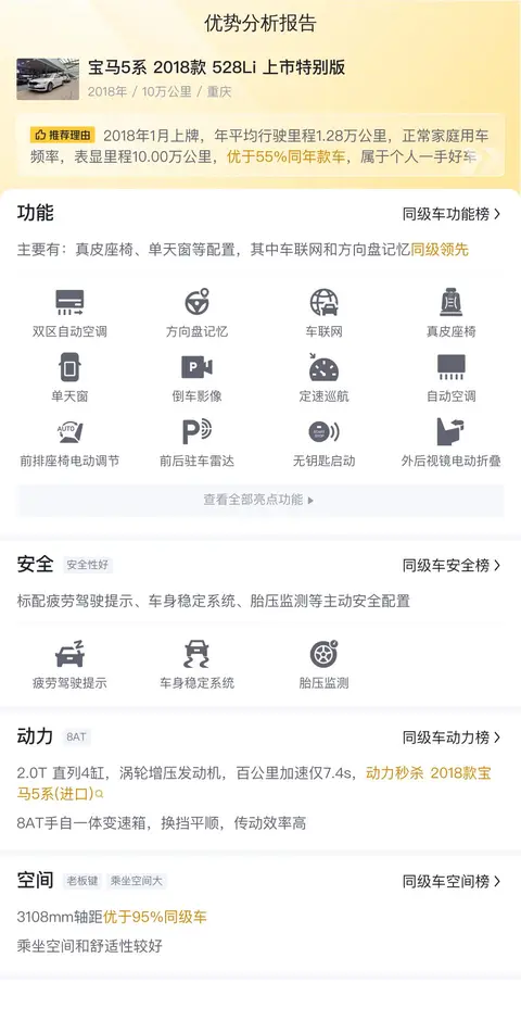 综上所述,这辆宝马5系 2018款 528Li 上市特别版是一辆性能出色、配置丰富的豪华轿车。它搭载的2.0T发动机提供了强劲的动力输出,配合8速手自一体变速箱实现了顺畅的驾驶体验。车内豪华配置丰富,为乘客提供了舒适的乘坐环境。根据市场行情分析,这辆车的售价相对较低,具有较高的性价比。