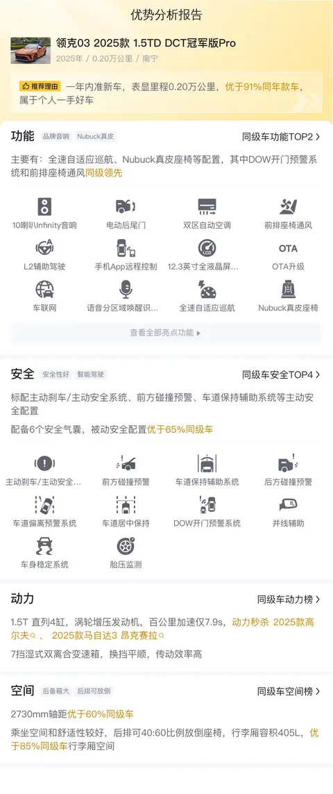 综上所述的新车含税价、用车成本、市场行情、优势分析、同款比价等数据仅供参考。在配置部分,因为二手车非标品,车辆可能会存在配置改装的情况,具体车况信息需要线下结合车辆实际情况进行综合参考。