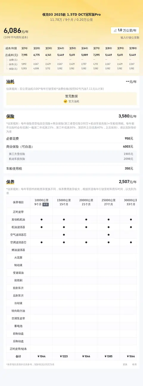同时,我们将为您展示该车6年平均用车成本的预估情况,包括每年在燃油、保险以及保养上的大约花费,帮助您更全面地掌握这款车的使用成本。