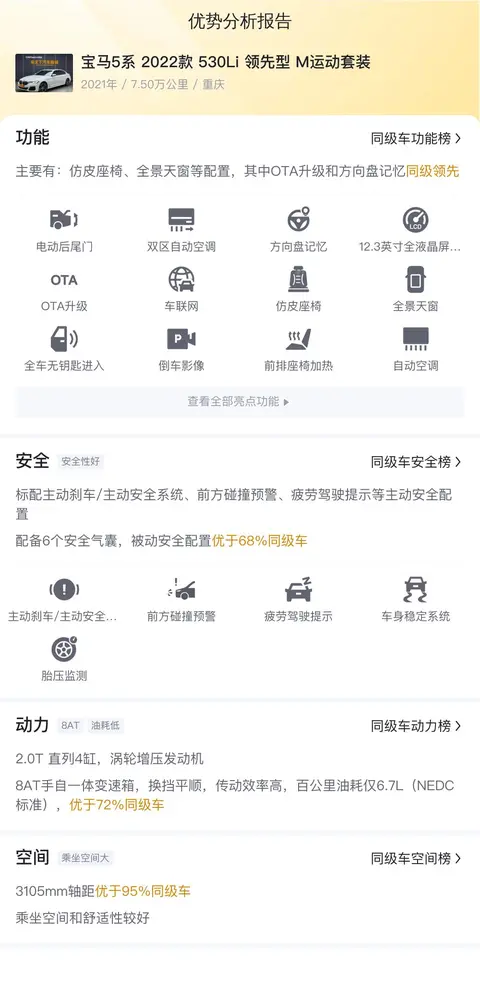 综上所述的新车含税价、用车成本、市场行情、优势分析、同款比价等数据仅供参考。在配置部分,因为二手车非标品,车辆可能会存在配置改装的情况,具体车况信息需要线下结合车辆实际情况进行综合参考。