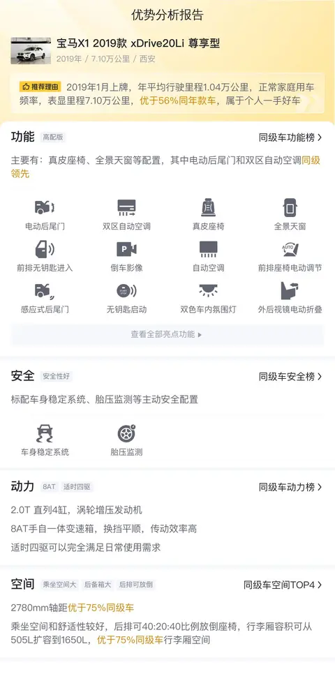 这辆宝马X1 2019款 xDrive20Li 尊享型配备了宝马专业级音响系统、全景天窗、前排座椅加热、导航系统以及宝马互联驾驶服务等高级配置。在安全方面,它拥有前后部驻车距离报警器、上坡辅助、陡坡缓降等功能,并采用前后五连杆独立悬挂系统,兼顾操控性和乘坐舒适性。