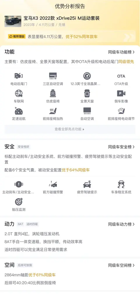 与同级别的其他竞品车型相比,这款宝马X3 xDrive25i M运动套装在动力性能、内饰材质、座椅舒适度、智能互联以及越野能力等多个方面都展现出了显著的优势。首先在动力性能方面,其所搭载的2.0T直列4缸涡轮增压发动机配合8AT手自一体变速箱和适时四驱系统,为驾驶者提供了充沛的动力输出和平顺的操控体验。而在内饰方面,高级材质的运用和精细的做工营造出了豪华氛围,特别是M运动风格座椅不仅提供了出色的支撑性还融入了M徽标细节彰显了独特身份。此外车辆还配备了丰富的智能互联功能如手机互联映射和语音识别控制系统让驾驶更加便捷智能。最后在越野能力方面xDrive智能全轮驱动系统和多连杆式独立悬挂系统确保了车辆在复杂路况下的稳定性和通过性让驾驶者无论身处何地都能感受到安心与自信。当然每一款车都有他的侧重点,没有绝对完美的车型,只有更适合您的车型。