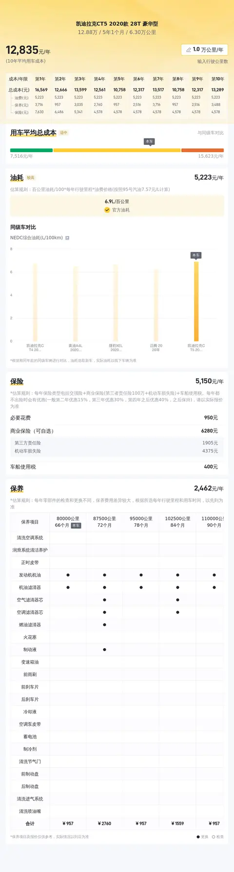 根据估算,这辆凯迪拉克CT5 2020款 28T 豪华型的10年平均用车成本约为13408元/年,而本车的10年平均用车成本大概是12800元/年,用车成本与同级车相比处于较低的水平。这个用车成本包含燃油费、保险费及保养费,具体金额可能会根据用车频率及行驶里程略有不同。