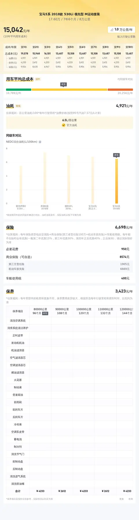 根据大数据分析显示,该车型的10年平均用车成本为14645元/年,而该车型的10年平均用车成本为15378元/年。这表明该车型的用车成本相对于同级车来说偏高。然而,从曲线图中我们可以看到,该车型的用车成本在前几年相对较高,但随着车龄的增长,用车成本的增长速率会逐渐放缓。因此,如果您打算购买这辆二手宝马5系,建议您在预算中留出足够的资金用于日常使用和维护保养。