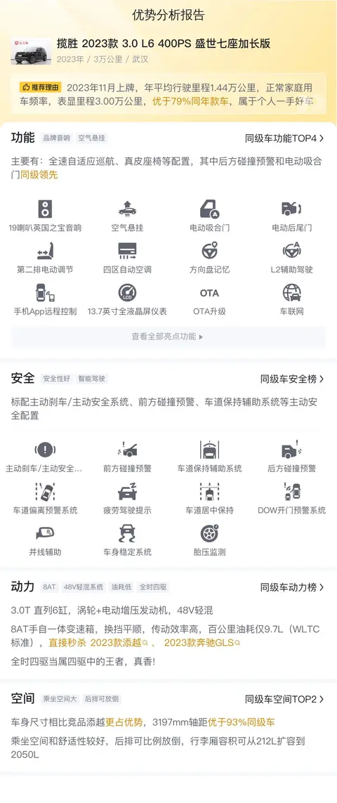 综上所述的新车含税价、用车成本、市场行情、优势分析、同款比价等数据仅供参考。在配置部分,因为二手车非标品,车辆可能会存在配置改装的情况,具体车况信息需要线下结合车辆实际情况进行综合参考。
