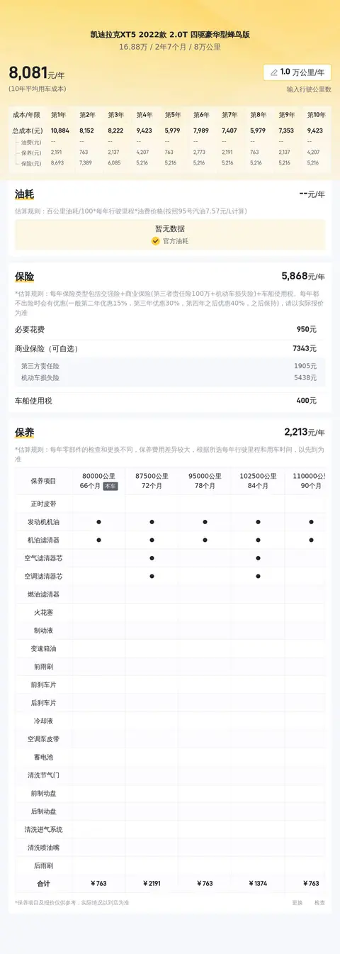 凯迪拉克XT5 2022款 2.0T 四驱豪华型蜂鸟版的10年平均用车成本为13667元/年,这个用车成本适中,具体数字还是要参考实际使用情况。