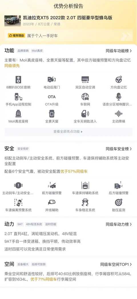 车辆的市场表现往往与其内在特质息息相关。今天,我们将深入剖析凯迪拉克XT5 2022款 2.0T 四驱豪华型蜂鸟版,从功能配置、动力性能、安全记录、空间表现以及维护保养五个关键维度,将其与同级别竞争对手进行全面对比。通过这场细致入微的SWOT分析(Strengths、Weaknesses、Opportunities、Threats),我们旨在揭示这款车型的核心竞争力与潜在局限,帮助您更加清晰地把握其市场定位与价值取向,为您的购车之旅提供有价值的洞察。