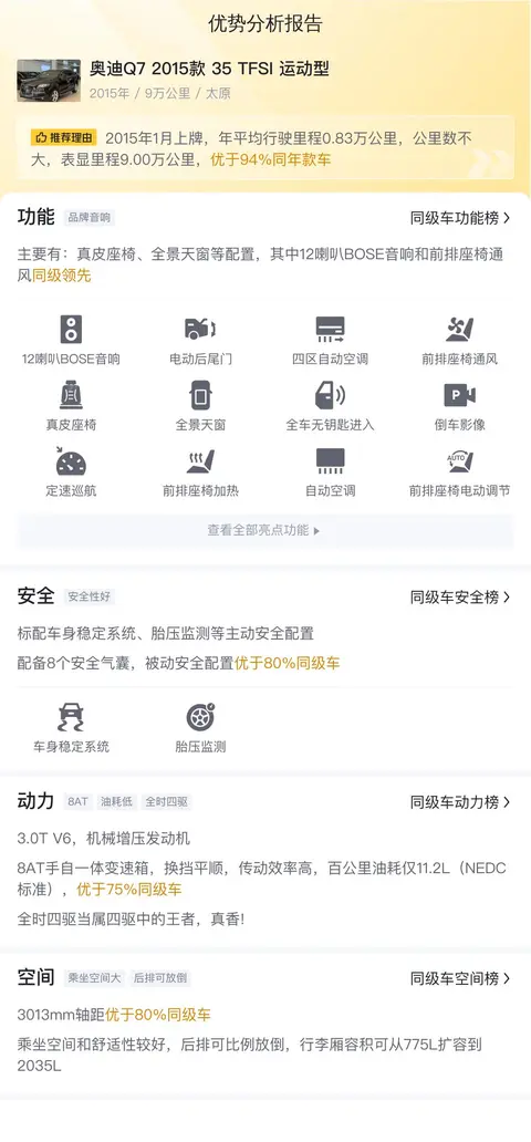 这辆奥迪Q7 2015款 35 TFSI 运动型定位是中大型SUV,车身外观颜色是黑色,内饰是深色配色。车源地和上牌地都是太原。2015年1月首次上牌,在此期间过户1次。同时至今累计行驶里程是9万公里,该车符合国IV排放标准。这辆车的新车含税价是97.89万,而现在的二手车报价是12.8万。