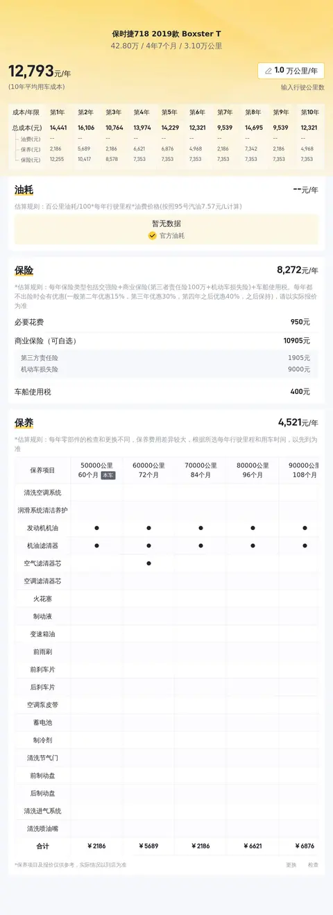 在用车成本方面,我们对保险费用、保养费用和油料费用进行了三年的总结和计算,让您对这款车的使用成本有更清晰的了解。