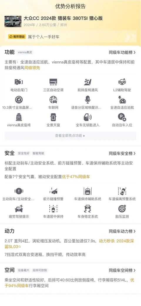 在配置方面,这辆二手大众CC 2024款 猎装车 380TSI 猎心版同样表现出色。该车搭载了一台2.0T 220马力 L4发动机,最大功率为162kW,最大扭矩为350N·m,配合7挡双离合变速箱,能够在7.9秒内完成0到100公里每小时的加速,展现了出色的的动力性能。同时,其WLTC综合油耗仅为7.28升,显示出良好的燃油经济性。车身尺寸方面,该车的长宽高分别为4869x1870x1459毫米,轴距达到2841毫米,为乘客提供了宽敞舒适的乘坐空间。此外,该车还配备了全速自适应巡航、10.3英寸全液晶仪表、三区自动空调等高级配置,以及L2级驾驶辅助系统,确保了驾驶的安全性和便捷性。尤其是其全车无钥匙进入和启动功能,以及方向盘加热和记忆座椅等冬季实用配置,更是凸显了其豪华与实用性。