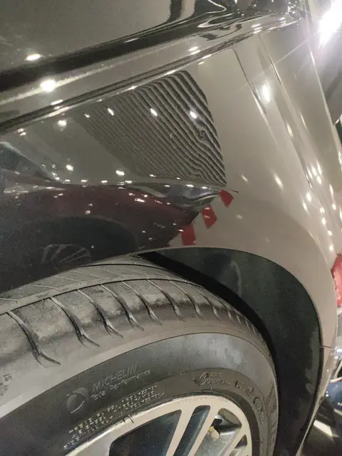 在外观检测部分,经过对汽车主要覆盖件检测,有2项问题需注意,具体是变形:左后翼子板,划痕:右后翼子板,以下是瑕疵项的详细实拍图。