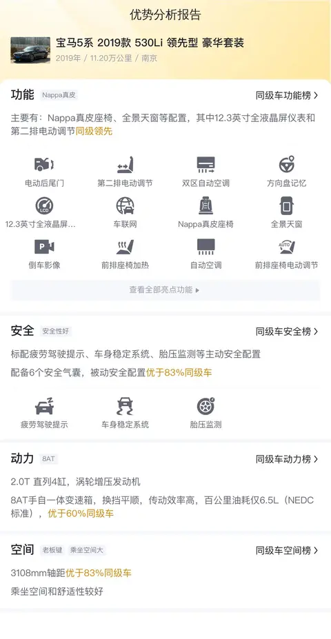 先介绍一下这辆车的基本信息,该车的具体版本是——宝马5系 2019款 530Li 领先型 豪华套装。该车的上牌日期为2019年2月,表显里程为11.2万公里,上牌地和车源地均为南京,车身颜色为黑色,过户次数为1次。该车新车指导价为46.39万元,目前二手车报价为17.5万元,相当于开近7年便宜了28.89万元。