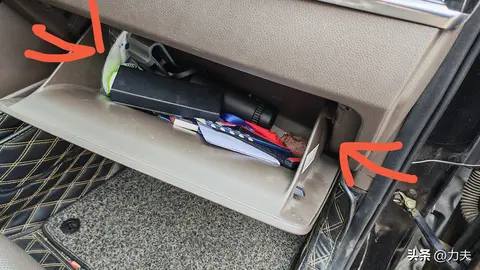 打开副驾位置的储物盒,清理好杂物,双手向内侧挤压两侧的塑料板,这一步是最难的,一般头一次不敢太用力,但这个地方不用力根本拉不开这个盒子。