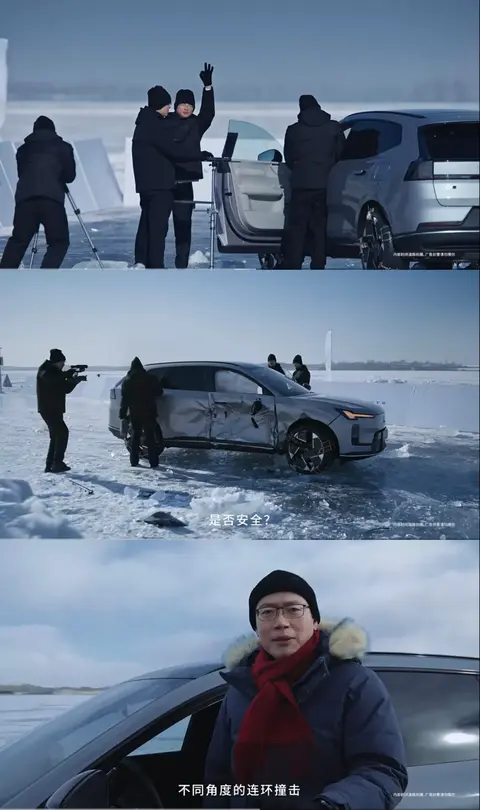 其二、冰天雪地,严寒刺骨的冰湖上,给新能源车搞所谓的“安全”测试,尤其考验动力电池在碰撞下会不会自燃起火……
