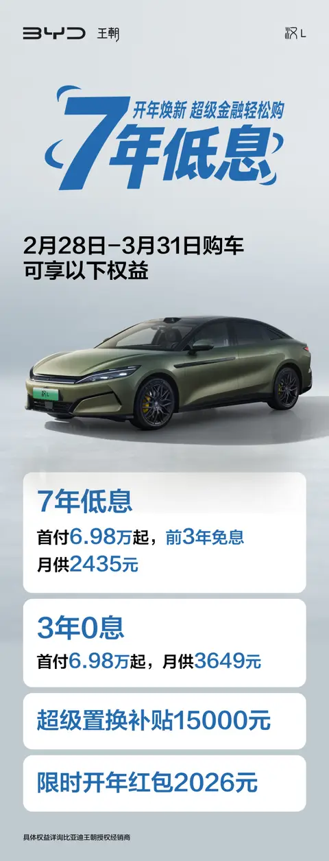 新年启幕,万象更新,正值购车好时节,比亚迪王朝网重磅开启“开年焕新选王朝 超级金融轻松购”活动,以真金白银的诚意,直降购车门槛。其中,王朝网更为划时代旗舰轿车汉L量身定制极具诚意的金融方案与多重礼遇,首付仅6.98万起。作为比亚迪顶级技术的集大成之作,汉L以硬核实力重塑20~30万级旗舰轿车标杆,如今更以丰厚权益,让更多年轻消费者轻松入主心仪旗舰座驾。