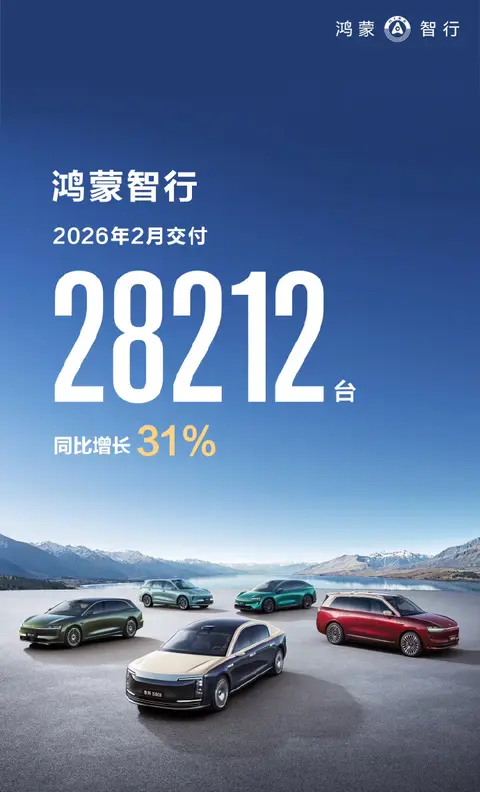 新势力这边,据小米汽车,2月交付量超过2万辆,1月交付量超39000辆;据零跑汽车,2月交付量为28067辆,1月为32059辆;据理想汽车,2月交付量为26421辆,1月为27668辆;据蔚来汽车,2月交付量为20797辆,1月为27182辆;据小鹏汽车,2月交付量为15256辆,1月为20011辆;据极氪汽车,2月交付量为23867辆,1月为23852辆;据鸿蒙智行,2月交付量为28212辆,1月为57915辆;据岚图汽车,1-2月共计交付18873辆,其中1月交付10515辆。