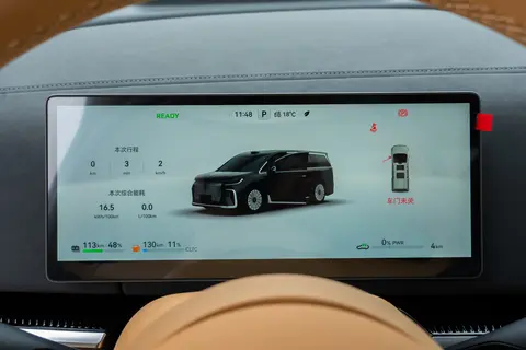 从能源结构来看,这款车采用插电式混合动力系统,搭载1.5T涡轮增压四缸发动机(型号DFMC15TE3),最大功率110kW(净功率105kW),最大扭矩220N·m,配合双电机实现电动四驱布局。值得注意的是,其发动机热效率高达45.18%,这在当前混动技术中属于较高水平,有助于提升燃油经济性。电动机部分由前置150kW与后置160kW永磁同步电机组成,总输出422马力,系统综合功率420kW,综合扭矩840N·m。这样的动力组合使其百公里加速时间达到5.9秒,最高车速203km/h,在同级别MPV中显得颇为活跃。更关键的是,其CLTC纯电续航为235公里,WLTC工况下为184公里,综合续航则高达1411公里(CLTC),这意味着日常通勤可完全用电,长途出行也无需频繁补能。此外,车辆支持400V高压快充平台,20%-80%电量仅需约0.5小时,快充接口与慢充接口均位于右侧油箱位,设计逻辑清晰。