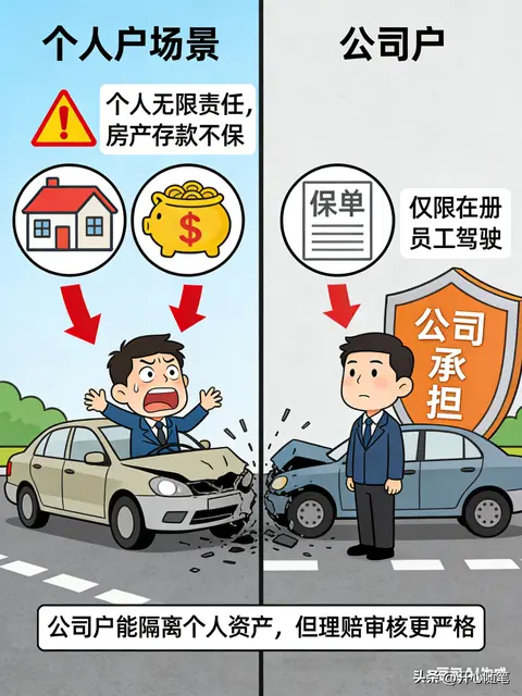 - 责任承担:如果车辆发生重大事故,赔偿金额超出保险限额,个人户车辆是车主个人承担无限赔偿责任,名下的房产、存款都可能被执行;而公司户车辆,是由公司承担赔偿责任,能隔离个人资产风险,这是公司户的第二大核心优势。